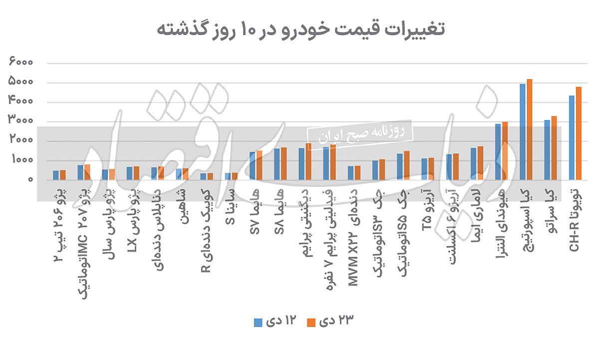 روزنامه «دنیای اقتصاد» بازار خودرو پس از خروج شورای رقابت از تعیین قیمت را بررسی کرده که این بررسی حکایت از آن دارد که طی ۱۰ روز گذشته قیمتها شوک جدیدی را تجربه کردند؛ به طوری که از ۲۳ محصول مورد بررسی «دنیای اقتصاد» در بازه زمانی ۱۲دی تا ۲۳دی، بهای خودروهای داخلی به طور میانگین ۲۶میلیون تومان یعنی ۴.۵درصد، خودروهای مونتاژی ۹۰میلیون تومان یعنی ۶.۶درصد و محصولات وارداتی دستدوم حدود ۳۴۰میلیون تومان معادل ۶ درصد رشد قیمت را ثبت کردهاند.